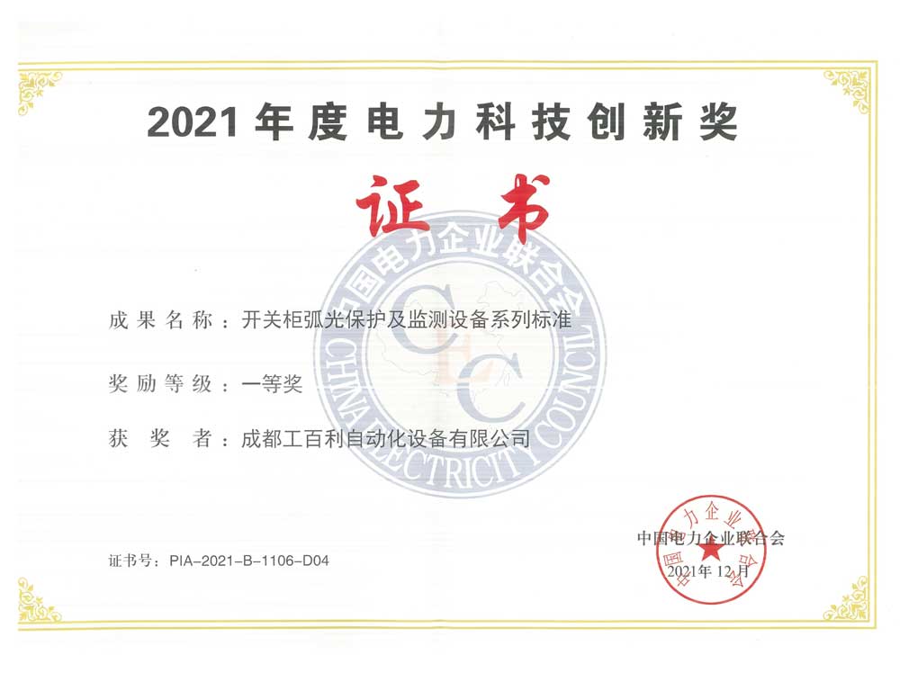 工百利荣获中电联 2021年度电力科技创新一等奖